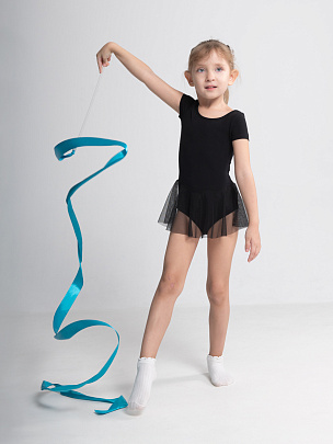 Гимнастический купальник слитный с шортиками, с коротким рукавом. Вырез горловины окантован бейкой из основного полотна.