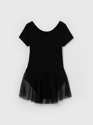 Купальник гимнастический с коротким рукавом и с юбкой из сетки в цвет основного полотна. Вырез горловины и проймы ножек окантованы бейкой из основного полотна.