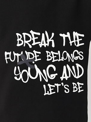 Джемпер с длинными рукавами, притачным поясом и манжетами. Манжеты и пояс выполнены из основного полотна. Горловина круглая с притачным воротником из полотна с добавлением лайкры. Перед и рукав декорированы принтом "Нарушай правила, будущее пренадлежит любознательным, юный и безбашенный, давай будем легендарными".
