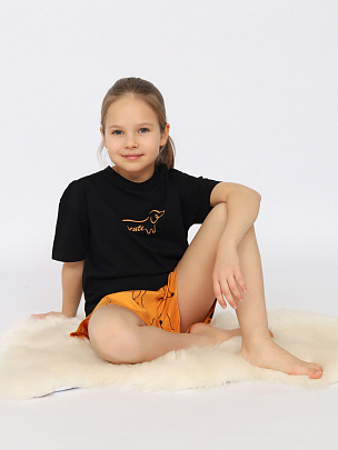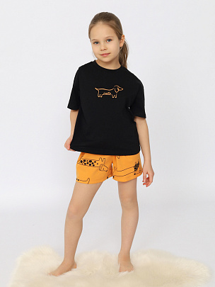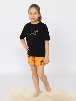 Пижама комбинированная из футболки и шорт. Футболка оверсайз с коротким рукавом. Горловина обработана притачной бейкой из рибаны с лайкрой. Перед оформлен небольшим принтом. Шорты набивные, свободного покроя длиной до середины бедра. Цельнокроенный пояс обработан плоским швом вподгибку с одновременным прокладыванием резинки.