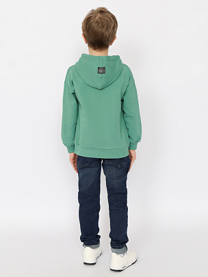 Толстовка с длинными рукавами, притачным поясом и манжетами. Манжеты выполнены из полотна с добавлением лайкры, пояс выполнен из основного полотна. Капюшон со шнурком и подкладкой, верхняя часть декорирована вязаной нашивкой. Перед декорирован принтом "Катайся каждый день".
