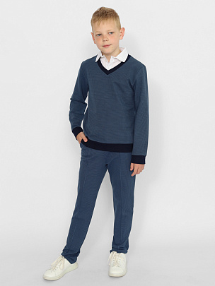 Джемпер с длинным втачным рукавом и манжетами. Манжеты, воротник и пояс выполнены из полотна с добавлением эластана. В горловине расположена эмитация рубашки с отложным воротником и стойкой.