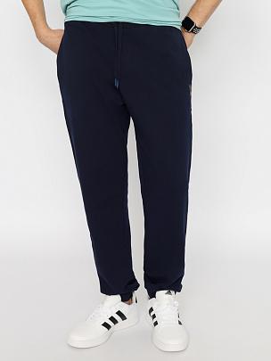 Брюки на манжетах внизу. Отрезной пояс выполнен из основного полотна. В поясе функциональный кругловязаный шнур вставлен в петли. Карманы наклонные в боковых швах. Декорированы жаккардовой этикеткой.